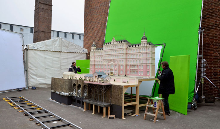 A címszereplő szálloda enteriőr dizájnját egyébként a Gorlitzer Warenhaustól, egy csődbe ment szecessziós kelet-német áruháztól kölcsönözte Adam Stockhausen látványtervező. Az oszlopok, a lépcsőház, az ablakok és a hatalmas csillár már a forgatás előtt ott volt, de minden mást a stáb épített. A berendezéseket a rendező Prágaban, Csehországban, Bécsben valamint Budapesten tett látogatásai ihlették. A film meghatározó hangulatát és Zubrowka világát Karlovy Vary adja, a címszereplő szálloda külsejét pedig a Grandhotel Moskva-Pupp és a Hotel Bristol inspirálta.